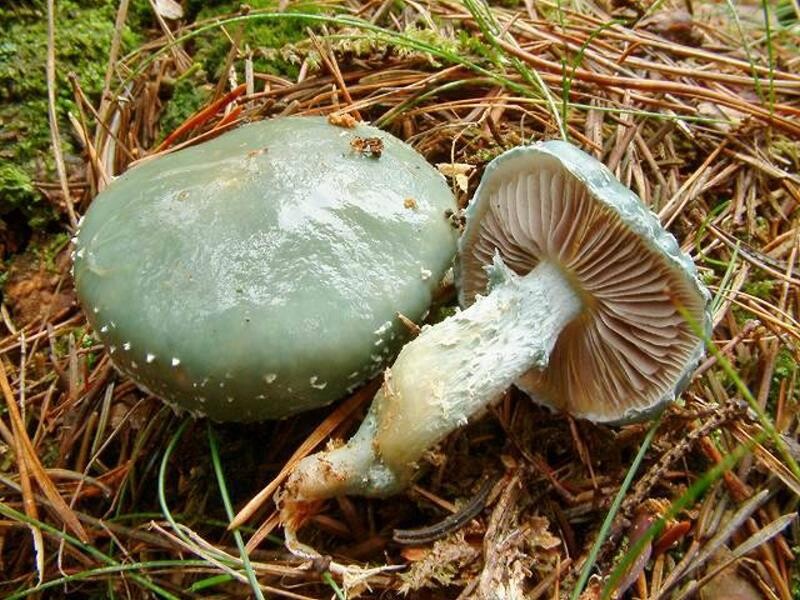 Stropharia aeruginosa - Grünspan Träuschling ( Curtis 1778 : Fr.1821 ) Quélet 1872 Key Words: Basidiomycetes - Agaricales - Strophariaceae - Stropharia = Träuschlinge Saprobiont - Vorkommen: einzeln oder gesellig in Wäldern auf vergrabenem Holz und faulenden Pflanzenresten. Auch ausserhalb von Wäldern in Park.- und Kompostieranlagen. Gefährdung: häufig und nicht gefährdet. Bemerkungen: sehr ähnlich ist S. caerulea der Blaue Träuschling. Mit etwas Übung ist er aber in freiem Felde gut von der abgebildeten Art zu unterscheiden. Der nur in Fragmenten vorkommende Ring, die nicht weissflockigen Lamellenschneiden und die eher bläuliche Färbung der Huthaut sind makroskopische Merkmale, die auf S.caerulea schliessen lassen. Übergänge zwischen beiden Arten sind möglich, mikroskopisch sind sie jedoch recht gut trennbar. Fundort: Bexbach - Saarland