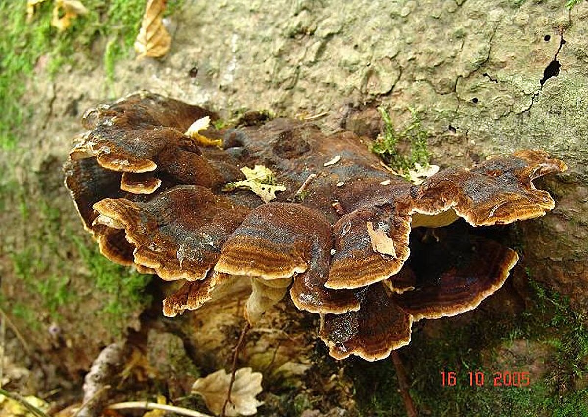 Ischnoderma benzoinum - Schwarzgebänderter Harzporling ( Wahlenberg 1826 : Fr. 1828 ) Karsten 1881 Klassifikation: Funghi, Dikarya, Basidiomycota, Agaricomycotina, Agaricomycetes, Polyporales, Ischnodermataceae, Ischnoderma Saprobiont - Vorkommen: an totem Holz von Weisstanne und Fichte. Gefunden an Weißtanne. Gefährdung: nicht sehr häufig aber nicht gefährdet. Bemerkungen: der Pilz könnte mit dem Laubholz - Harzporling verwechselt werden. Er ist seltener und besiedelt verschiedene Laubhölzer mit einer deutlichen Bevorzugung von Rotbuche. Ischnoderma benzoinum erzeugt am befallen Holz eine intensive Weißfäule. Wie alle Harzporlinge sind auch seine Fruchtkörper nur einjährig. weitere Bilder von Ischnoderma benzoinum - bitte hier klicken Fundort: Bexbach/Frankenholz - Saarland MTB: 6609/2