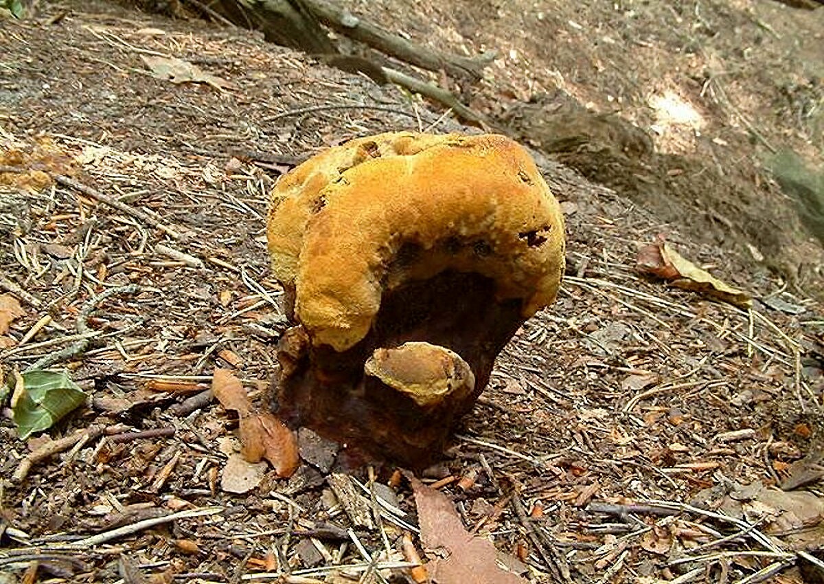 Phaeolus spadiceus - Kiefern Braunporling ( Pers.1800 : Fr. 1821 ) Rauschert 1988 Key Words: Basidiomycetes - Aphyllophorales - Polyporaceae - Phaeolus = Braunporling Parasit - Wirte: bevorzugt deutlich Kiefernarten. Aber auch an Fichte, Lärche und Kirsche. Basidiocarpien einjährig. Gefährdung: nicht sehr häufig, jedoch nicht gefährdet. Bemerkungen: Der Kiefern - Braunporling gilt als sehr aggressiver Braunfäuleerzeuger. Er dringt durch die Baumwurzeln bereits stark geschwächter Bäume ein. Nach dem Absterben dieser, ist er in der Lage als Saprobiont noch viele Jahre in ihrem Totholz weiter zu leben. Die Abbildung zeigt einen noch recht jungen Fruchtkörper, in unmittelbarer Nähe einer noch lebenden Kiefer. Fundort: Kirkel - Saarland