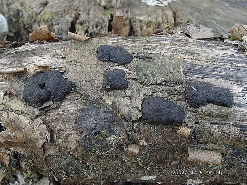 Hypoxylon_multiforme Hypoxylon multiforme - Vielgestaltige Kohlenbeere ( Fr. : Fr. ) Fr. 1849 Klassifizierung: Fungi, Dikarya, Ascomycota, Pezizomycotina, Sordariomycetes, Xylariomycetidae, Xylariales, Hypoxylaceae, Hypoxylon Saprobiont - Vorkommen: Auf dünneren Stämmen und Ästen verschiedener Laubgehölze. Birke wird deutlich bevorzugt. Gefährdung: häufig und nicht gefährdet Bemerkungen: die vielgestaltige Kohlenbeere ist mit etwas Übung recht leicht zu bestimmen. Sie hat eine dick krustenförmige Stromata , die sich oft mit anderen Stromaten verbindet, und so größere Flächen bildet. Fundort: Bexbach - Saarland