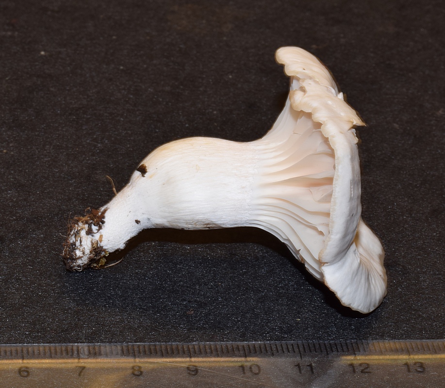 Der einzeln stehende, weiße Frkp., bei dem ich aus der Entfernung einen großen Ellerling vermutete, wuchs an sonnenexponiertem Standort in Hanglage im Gras.