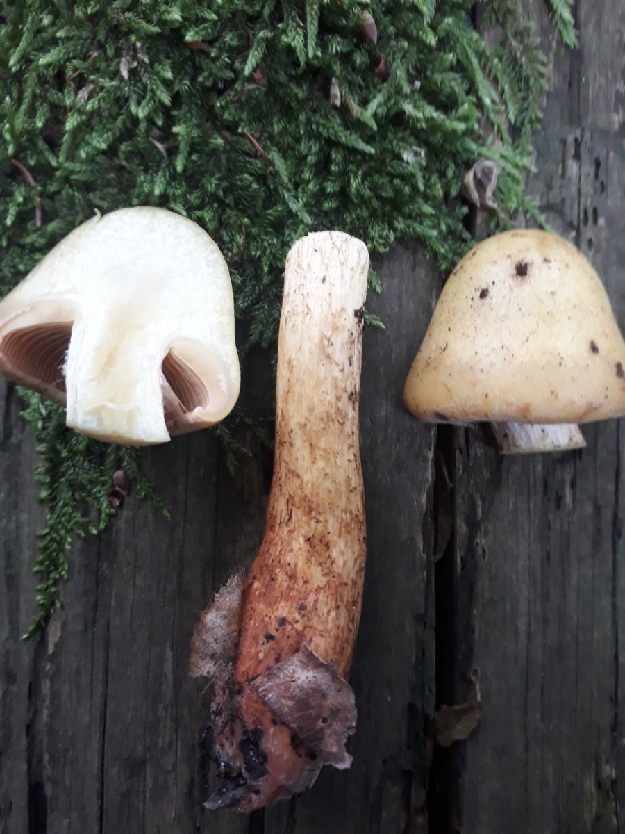 Irgendwo hab ich gelesen: "Alle Leistlinge sind essbar." Ich glaub, ich muss mal nachschauen, woran man einen Leistling zweifelsfrei erkennt. Das hier ist wahrscheinlich keiner, weil der erlegte sieht am Übergang von den Lamellen zum Stil nicht aus wie ein Pfifferling...