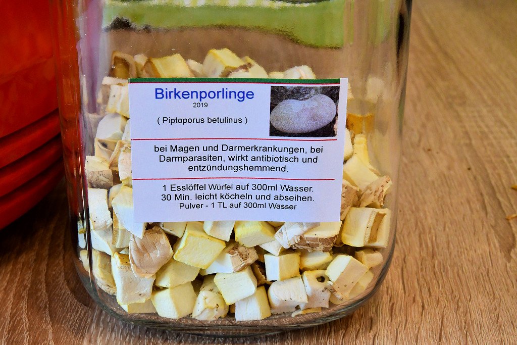 Morgen wird noch ein Teil der trockenen Würfel zu Pulver zermahlen. Mit dem Pulver kann man ebenfalls einen Sud zubereiten, der aber keine 30 Minuten köcheln muss. Hier reicht 5-7 Minuten. Ein halber Teelöffel Honig mildert den +- Bittergeschmack des Sudes ab. Dieser Bittergeschmack ist weniger schlimm wenn man ganz junge Birkenporlinge ( runde Knubbel ) verwendet. Man kann sich auch Leerkapseln besorgen und diese mit dem Pulver füllen. Es gibt sie in verschiedenen Größen als Gelatine oder als vegetarische Kapseln. Man sollte darauf achten das sich die Kapseln bereits im Magen auflösen und das Pulver freigeben. Meines Erachtens ist der Sud wirksamer, da hier die Inhaltsstoffe schon in gelöster Form vorliegen.