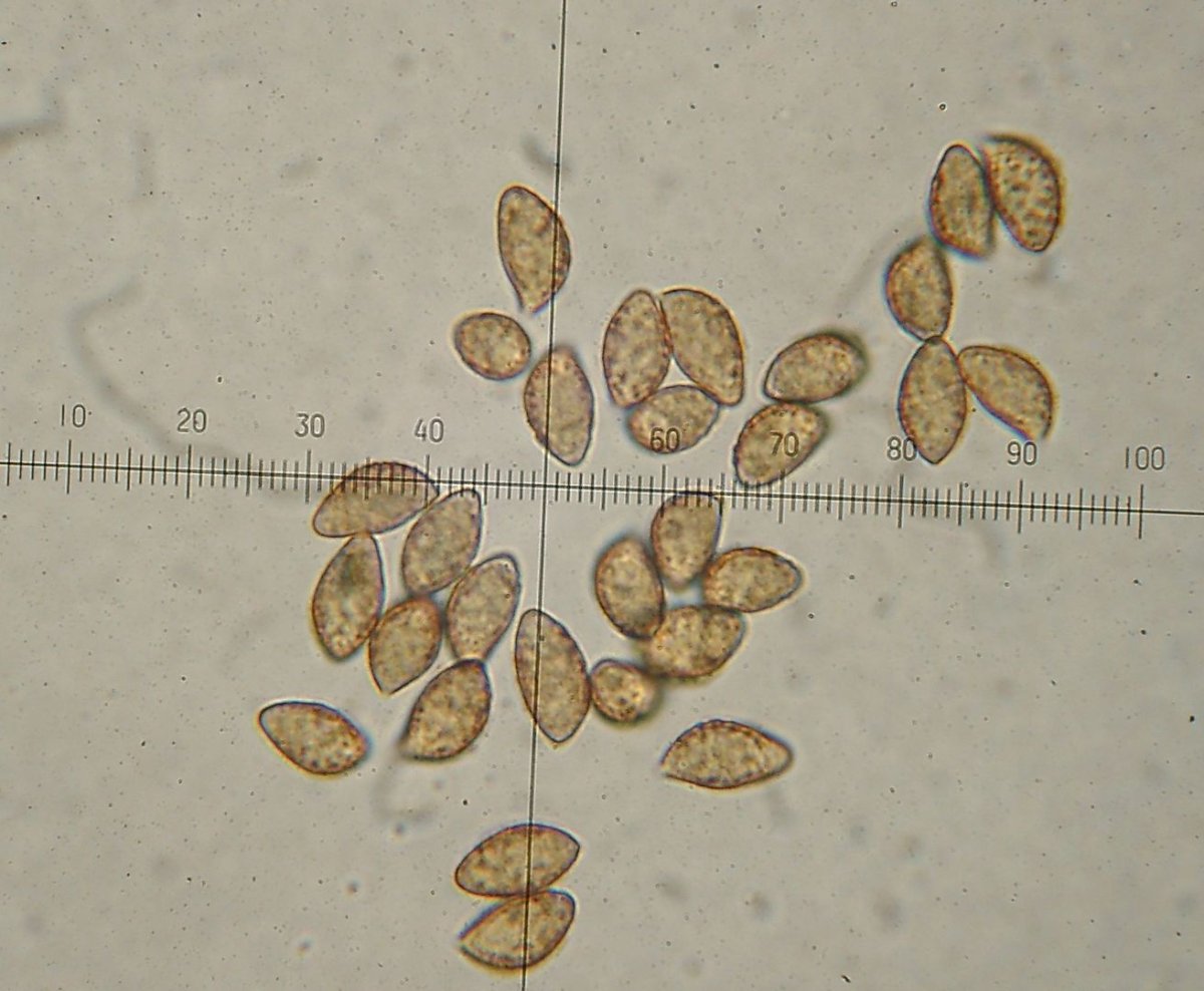 Sporen: mandelförmig, warzig. Die angegebenen Maße stimmen in etwa. Laut Literatur 9,5-12 x 5-6.